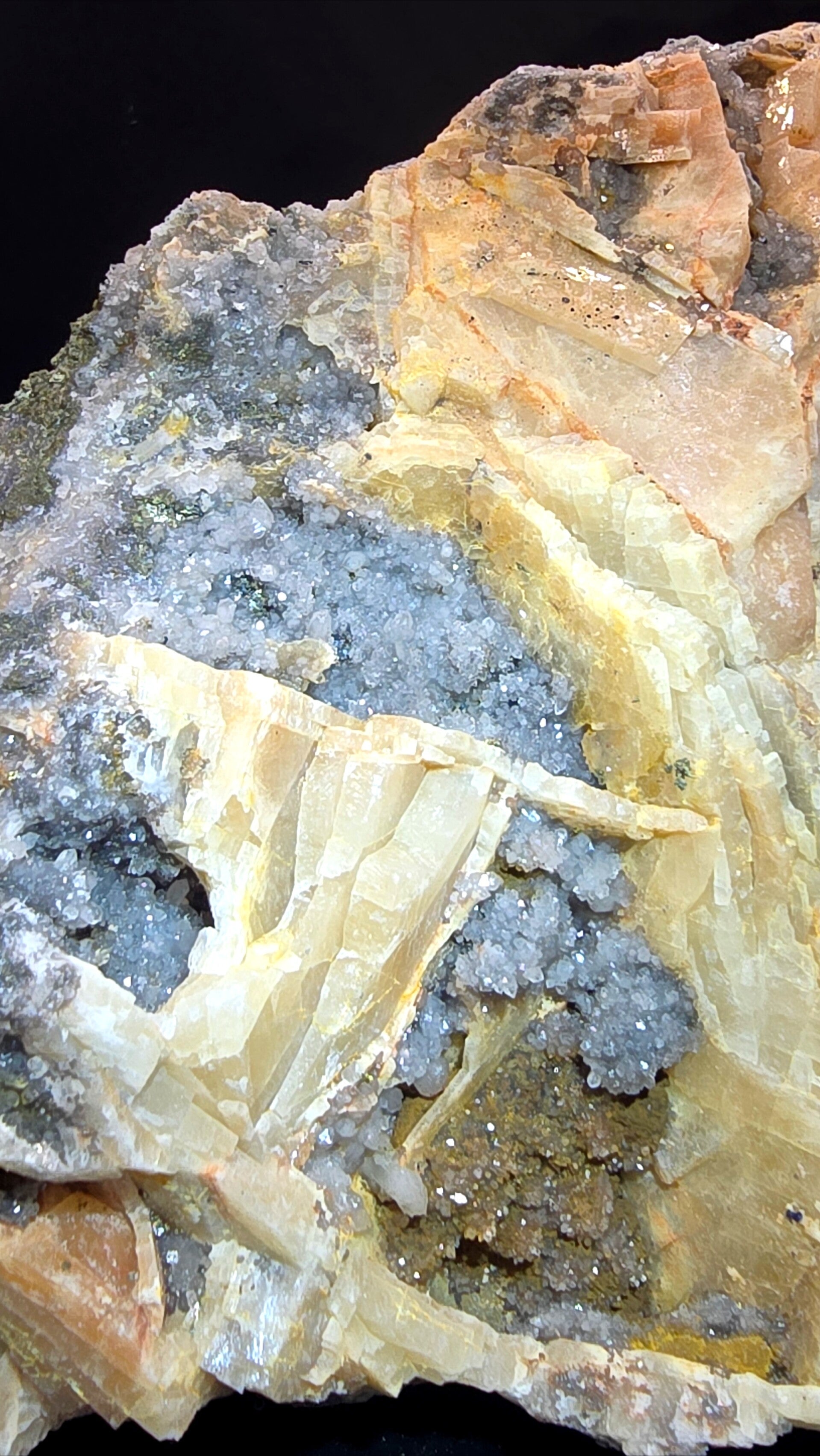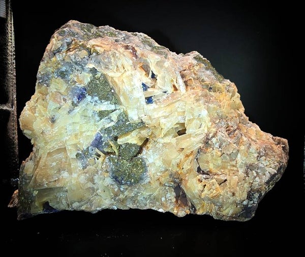 De mooie creme kleur bariet heeft enkele holtes die opgevuld zijn met Fluoriet, prachtige babyblauwe kwarts kristallen, Chalcopyriet en zelf Covelliet.