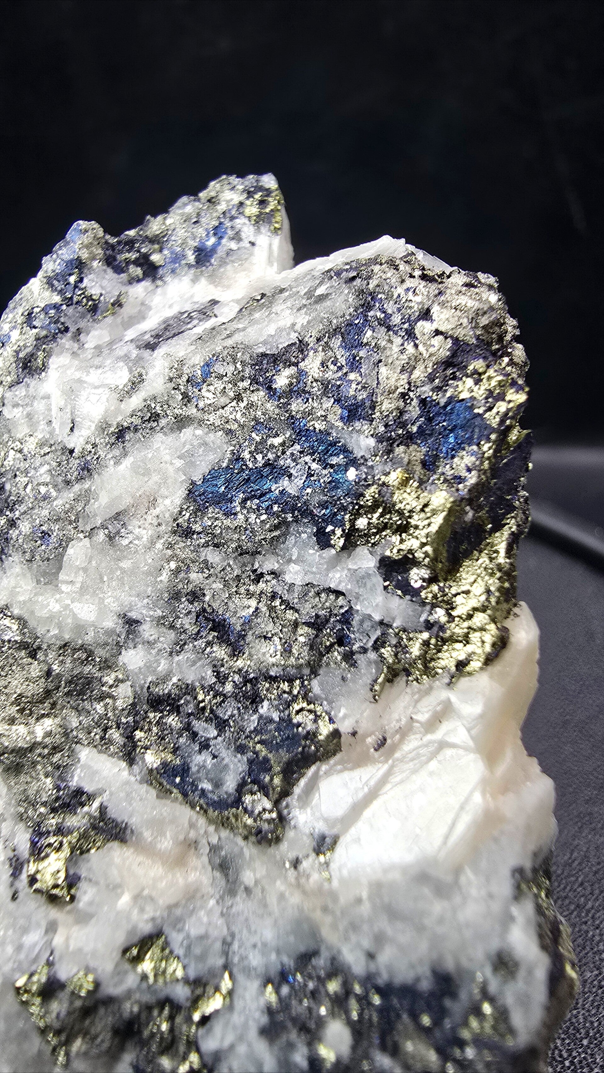 De (zeldzame) diep indigo blauwe Covellite contrasteerd sterk tegenover de helder chalcopyriet en kwarts.