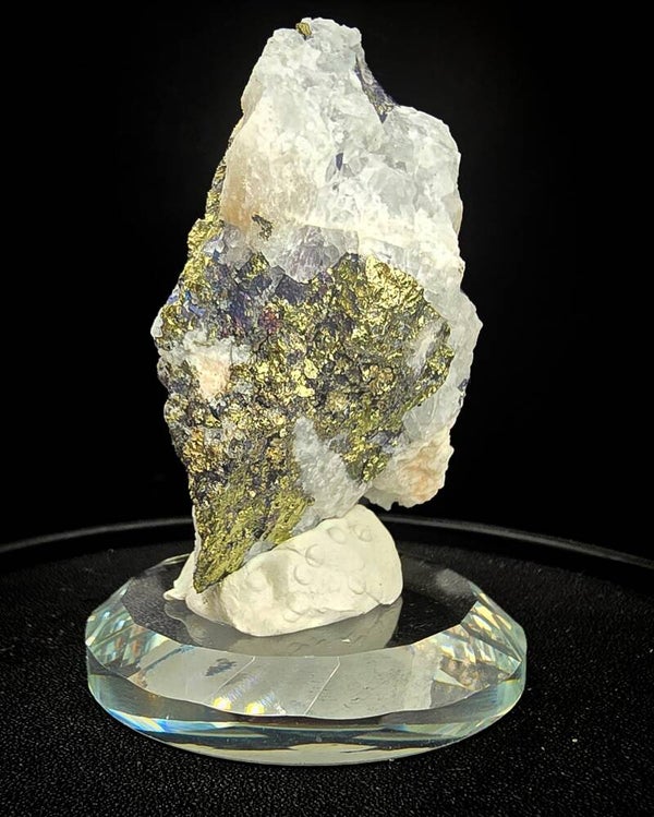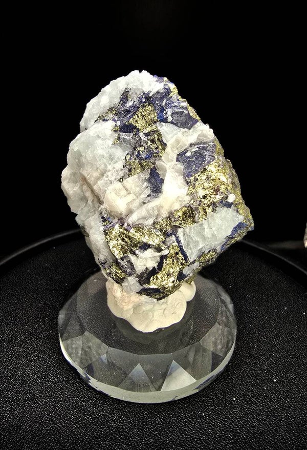 De (zeldzame) diep indigo blauwe Covellite contrasteerd sterk tegenover de helder chalcopyriet en kwarts.