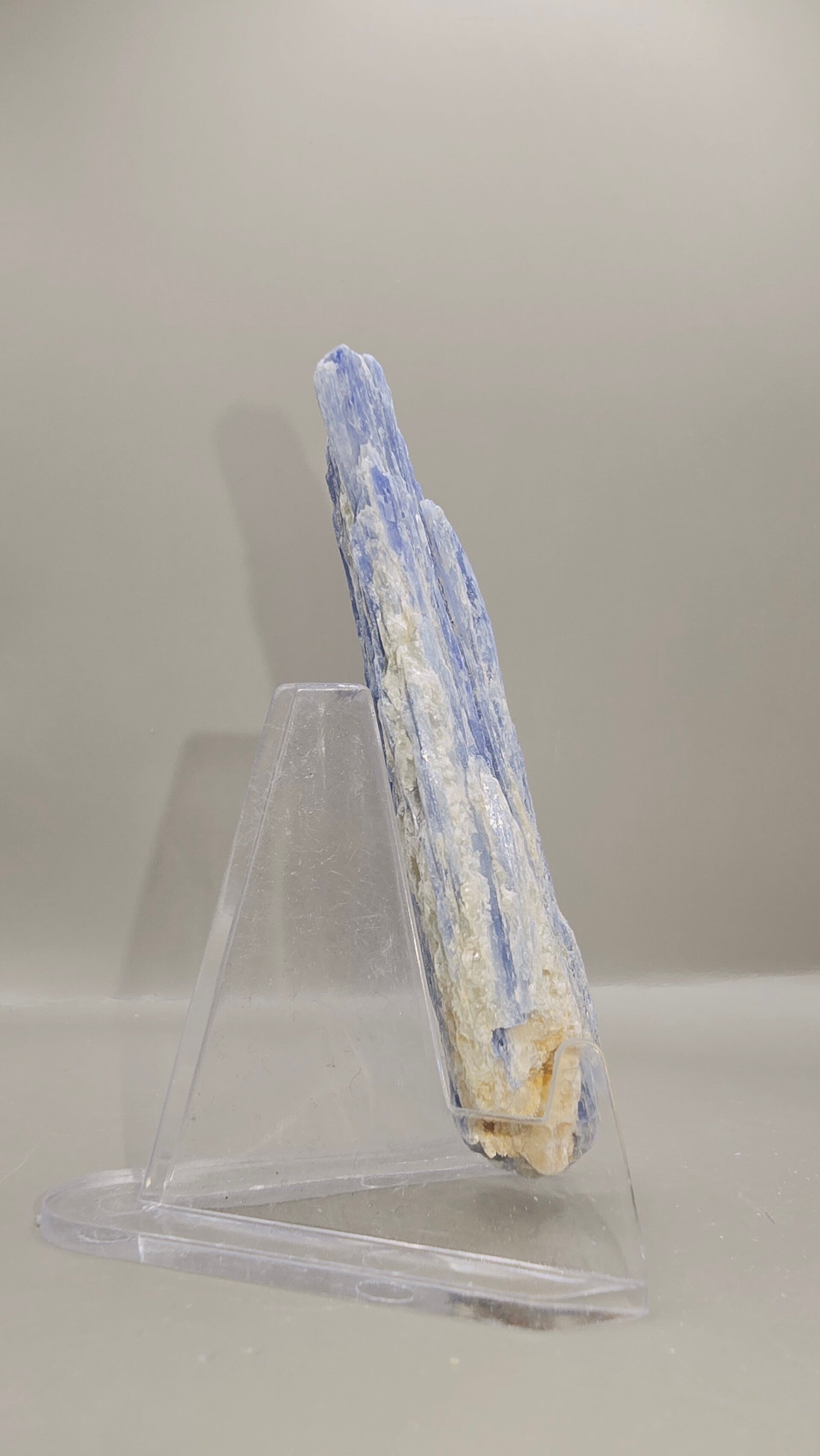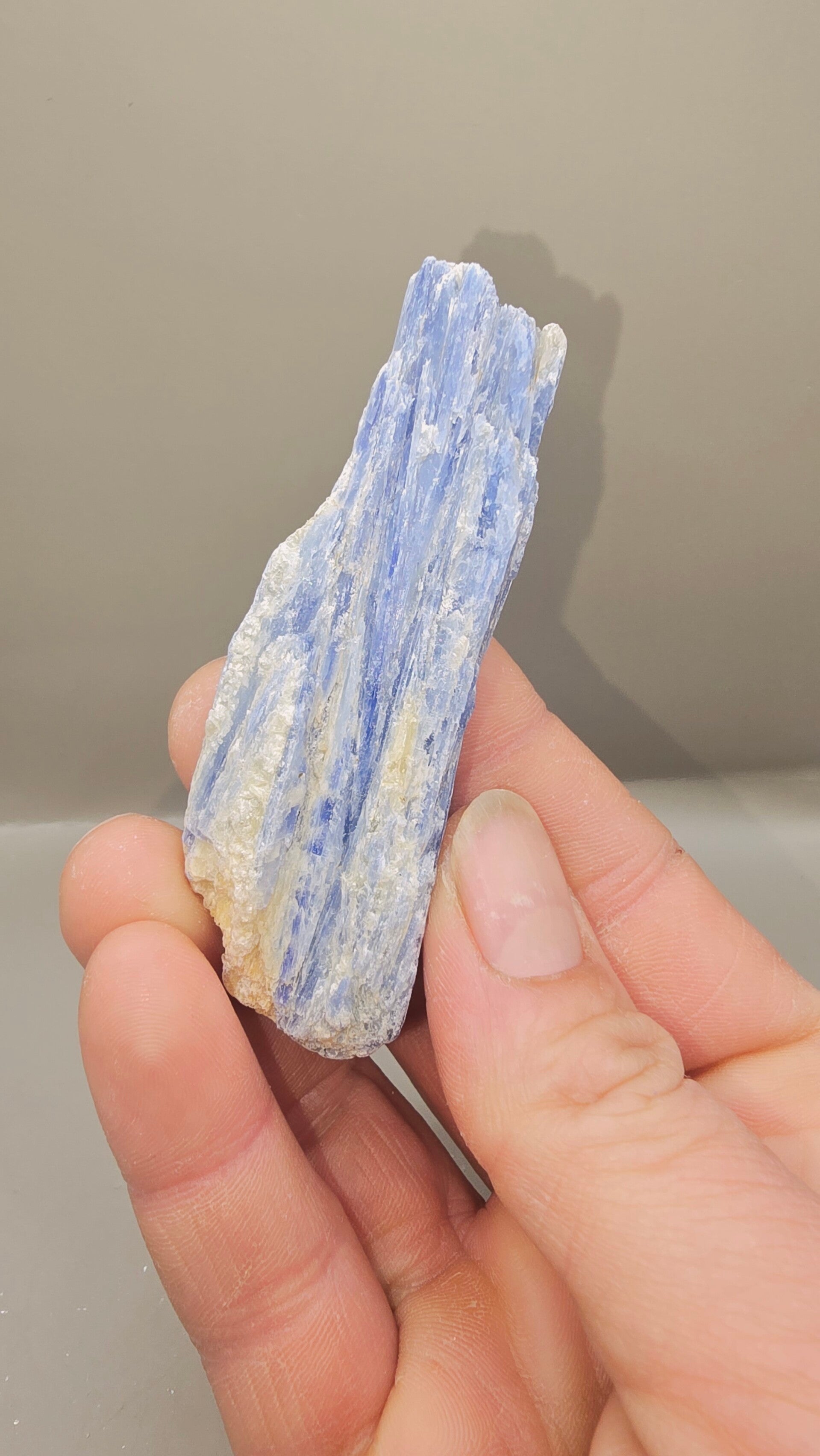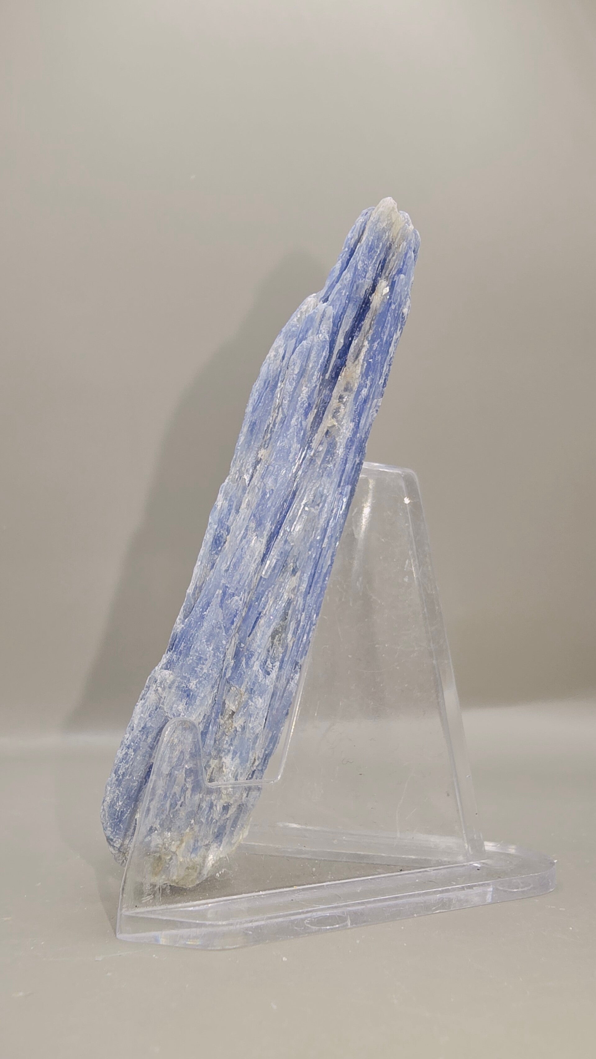 Deze blauwe kyaniet is geen standaard handelsmateriaal, maar een zorgvuldig geselecteerd natuurstuk.